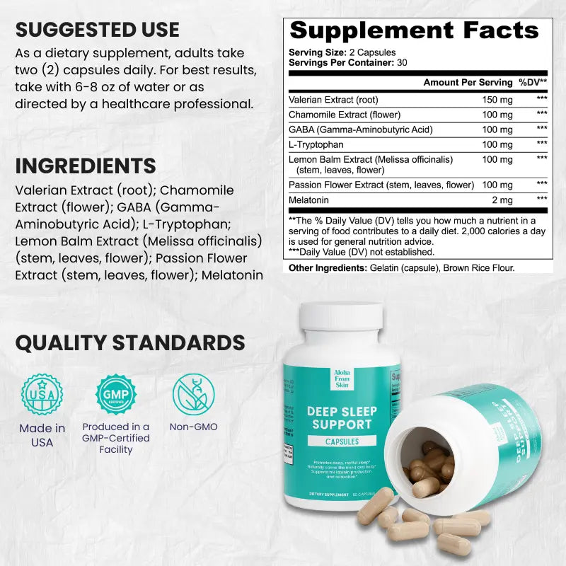 Deep Sleep Formula is a natural sleep-support supplement combining valerian, chamomile, passion flower, GABA, L-tryptophan, and melatonin. These ingredients work together to calm the nervous system, reduce tension, and support your body’s natural sleep-wake cycle — helping you fall asleep faster and stay asleep longer.*